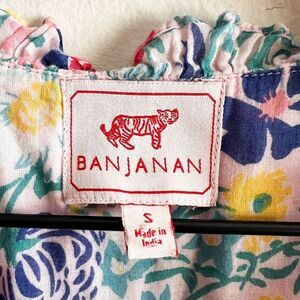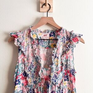 Banjanan Ellian Dress in Dawn Chorus Crystal Rose. Features short length, v neck, a line silhouette, hidden side pockets, partially lined, & ruffle neck detail. In good condition. No holes, rips, or stains. Ours is a smoke free home.