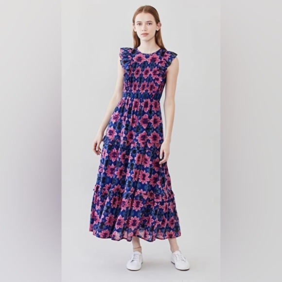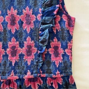 Relaxed, boho silhouette. Sleeveless with ruffled trim near opening - giving the illusion of small flutter sleeves. Crew neckline. Smocked bodice (front & back) including waist. Flowy, tiered skirt with ruffle details. Inseam side pockets at hips. Pullover design with a keyhole button closure at back neckline. Lined from the waist down only, no sheerness. Lightweight, non-stretchy (except smock) cotton voile. 100% cotton. Made in India. Machine wash cold (line dry/dry flat) - we recommend using a mesh bag to avoid snagging.