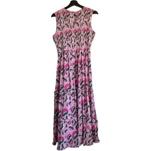 Banjanan Isha pink and green lotus maxi dress with smocking size medium. 100% cotton. Lined. Excellent condition. Waist tie.