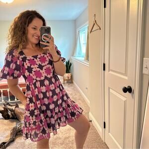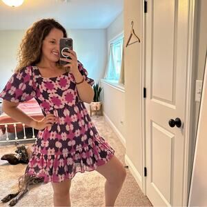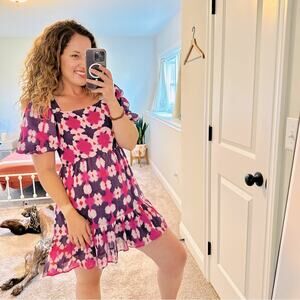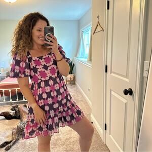 I’m so in love with this super stunning Tuckernuck Anthropologie Banjanan pink purple Ikat tie dyed puff sleeve square neckline cotton mini dress