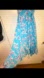 Sky blue dress with pink floral print. Features ruffled neckline and tie waist. Sleeveless design with a flowing skirt.