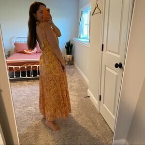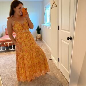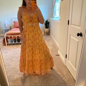 I am in love with this absolutely stunning & sexy/flattering designer Banjanan yellow/orange/pink floral cotton cutout front bow tie strappy sleeve tiered lined super soft and comfy maxi dress
