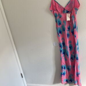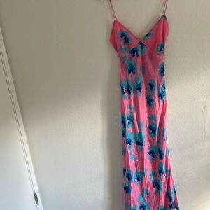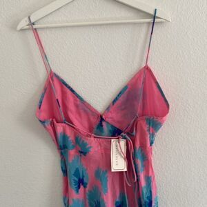 Details: Silk crepe dress with a deep v-neckline, self-tie back, and bold floral prints, zipper closure