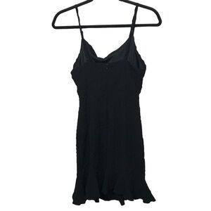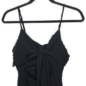 Black, sleeveless mini dress with tie detail at front and cut out detail. Has zipper closure on back and adjustable straps. In good condition. Slim fit.
