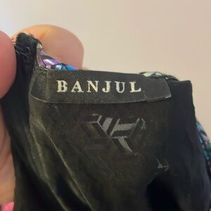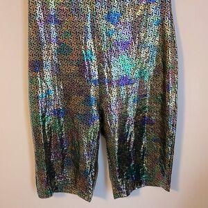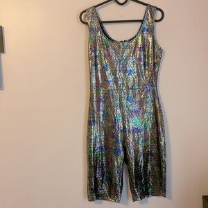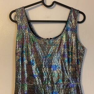 Banjul Iridescent Holographic Geometric Design Romper Size S. Very good preowned condition. Body hugging stretch material. Gorgeous Iridescent colors shiny. Zipper up back. Scoop neckline. Thicker tank straps. See pictures for approximate measurements. Bodycon. Sexy.