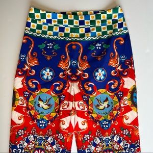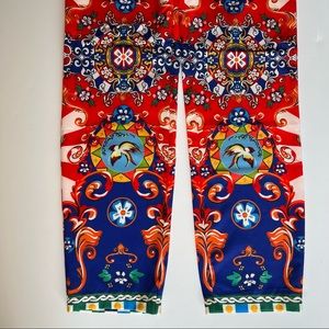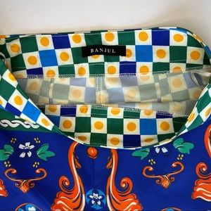 Vibrant wide leg pants by Banjul. Features bold patterns in red, blue, and green. Comfortable and stylish.