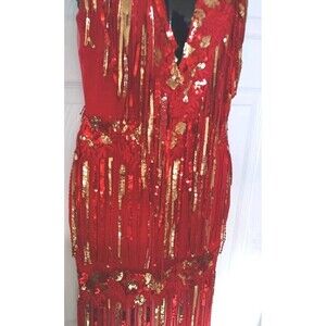 Banjul Sequin Mesh Maxi Dress Gown Size Small Red Gold Party Cocktail Sparkly