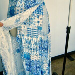 A great, flirty Summer Maxi dress with a sexy, but comfortable fit., The fabric is a crinkly gausy print in classic blue and white . It has a side zipper for better fit. THE FRONT BODICE IS LINED, BUT THE SKIRT IS NOT. Very light and flowy - romantic.