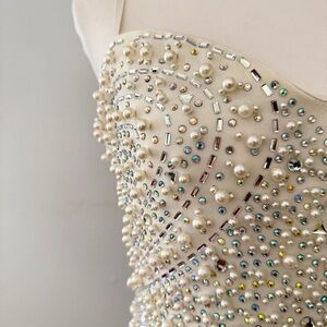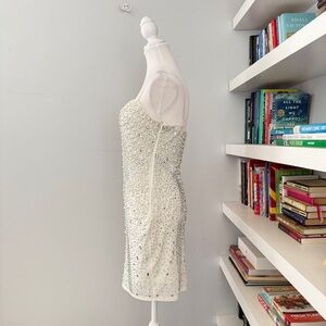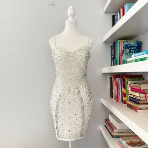 Sassy sexy white beaded mini dress. Dress is stretchy and fits like a body on dress.