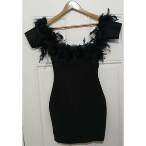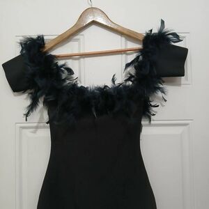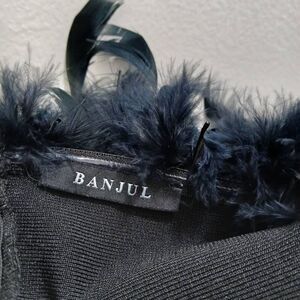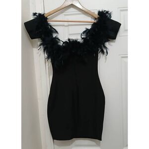 Banjul womens small pencil dress stretch black off shoulder 100% fur feather
