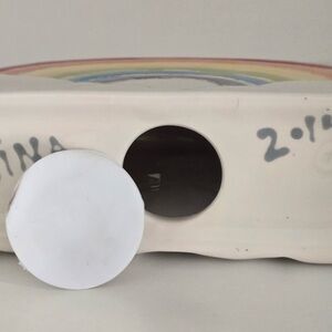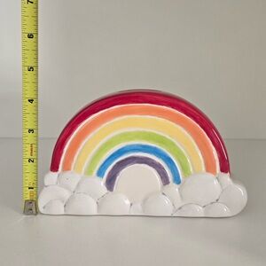 Charming hand-painted ceramic rainbow coin bank, signed and dated by the artist (2.14.20), making this a unique one-of-a-kind artisan piece. Beautiful glossy finish with vibrant rainbow colors over soft cloud details gives this piece a whimsical, happy aesthetic perfect for nursery décor, children’s rooms, or cheerful shelf styling.