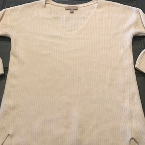 Worn once! This sweater is in mint condition! Fabric does not feel scratchy, very comfortable.