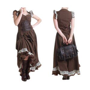 Amazing Victorian steampunk style dress in striking bronze/brown & black striped cotton fabric. The Brown Black Steampunk long Dress features a brown/black striped pattern with copper screws. It has a high collar and brown faux leather details with white lace. Dress is adjustable to various lengths with copper D-rings and clips to the front and fastens at the back with a zip. Made from Cotton blend, this looks amazing when teamed with Steampunk bags and shoes.