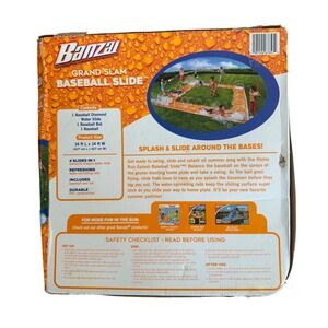 A Banzai Grand Slam Baseball Slide water toy for outdoor fun. This diamond-shaped water slide brings the baseball experience to your backyard with refreshing water-sprinkling lanes. It includes a bonus baseball bat and ball for added play. Perfect for backyard parties, summer days, or birthday celebrations.