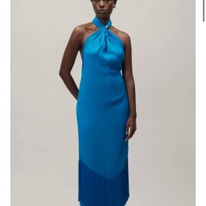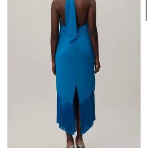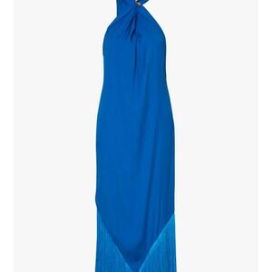 Elegant blue maxi dress. Halter neck design. Fringe detail at hem.