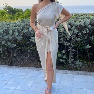 Gorgeous silk champagne-colored dress by Baobab. Size Small, in great condition. The shoulder has become unbunched, but could easily be repaired.