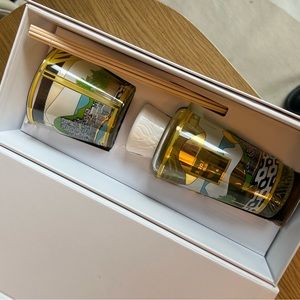 The Rio-scented candle and fragrance diffuser gift box is covered with a gold and color silkscreen print that reflects this metropolis’ mythical architecture. One recognizes the museum of contemporary art of Niteroi drawn by the architect Oscar Niemeyer, the cobblestones bordering the beach of Ipanema, and a soft horizon with a glimpse of Sugarloaf Mountain. The fragrance of bergamot, green tea, and musk will take one to the warmth of this tropical city. Imported.