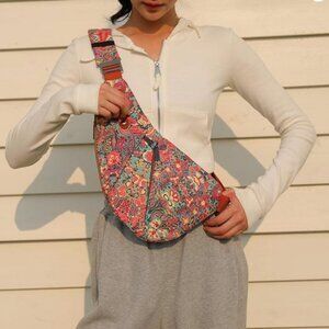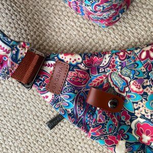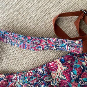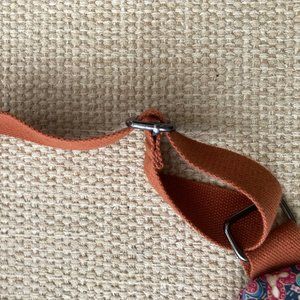 Part of the adjustable straps are a golden brown color thick cotton fabric. Strap is 1.5" wide