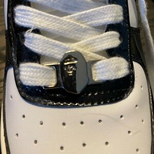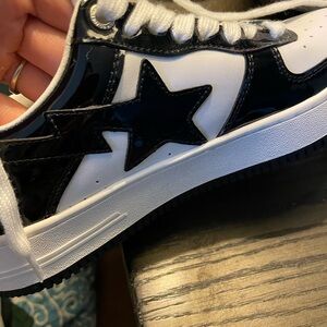 Stylish Bape shoes with iconic star design. Sleek black and white look.