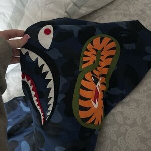 Stylish Bape zip-up sweater. Features iconic shark design. Blue camo pattern. Comfortable and trendy.