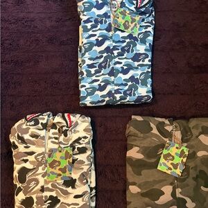Men's zip-up sweater with a bold camouflage design. Features a distinctive shark hood. Comfortable and stylish.