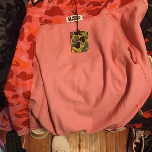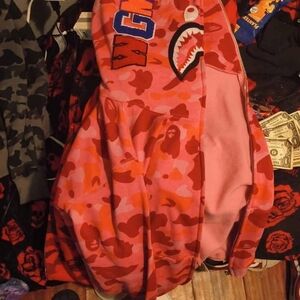 Stylish Bape zip-up sweater. Features pink and red camo pattern. Iconic shark design on hood.