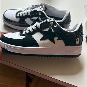 Glossy Bape STA sneakers with a bold black and white contrast. Features perforated toe and secure lace-up style.