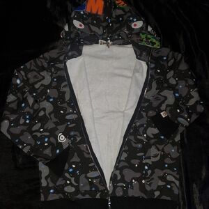 The Bape Shark Hoodie in black, is an authentic piece of clothing designed by the popular brand Bape Shark. Made of cotton with a camouflage pattern, this hoodie features long sleeves, a regular fit, and a full zip style. Machine washable and suitable for winter, this Japanese-made hoodie is perfect for men looking for a stylish and comfortable activewear option for walking or other outdoor activities. The Bape Shark Hoodie is a must-have for fans of the brand and those looking for a fashionable addition to their wardrobe.