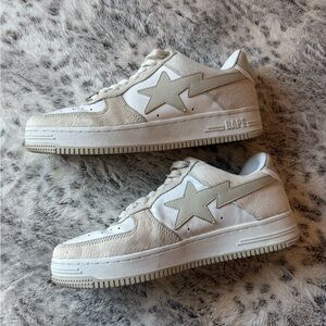 Bape sneakers with a star design. White and tan color scheme. Classic style.