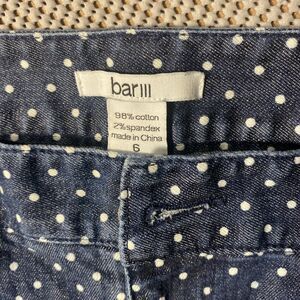 The Bar 111 Jeans for Women in size 6 feature a fun and stylish polka dot pattern, making them a fashionable choice for any outfit. With a waist size of 30 inches, these jeans are designed for a comfortable and flattering fit. Perfect for adding a playful touch to your wardrobe, these jeans are a versatile option for everyday wear.