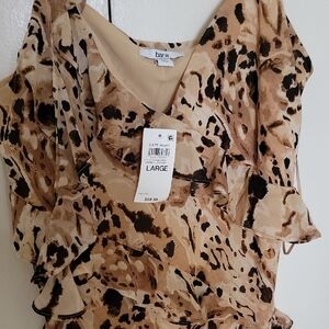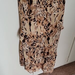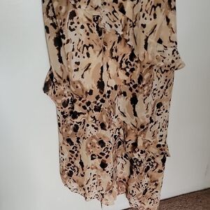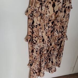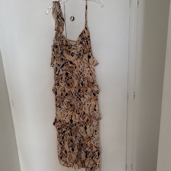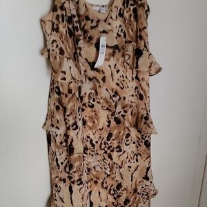 nwt Lightweight beige dress with an abstract brown and black print. Features delicate shoulder straps and layered ruffle details for feminine movement. Easy-to-wear slip silhouette suitable for day or evening wear.