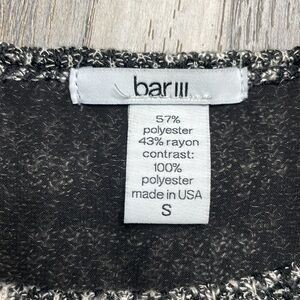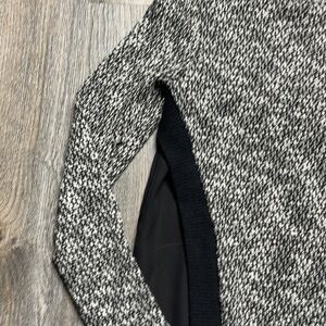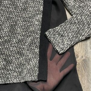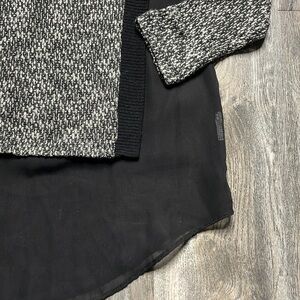 Bar III Black & White Marled Knit Sweater Over Black Sheer Lining, size small. In excellent used condition. Pictures don’t do this too justice. The side slits with the sheer material underneath is beautiful. See pictures for measurements and fabric content.