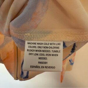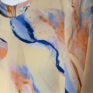 This Bar III blouse showcases a captivating abstract design in blue and orange hues, offering a fitted silhouette with long sleeves. The artistic pattern and soft fabric make it an ideal choice for both casual and semi-dressy occasions.