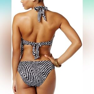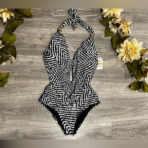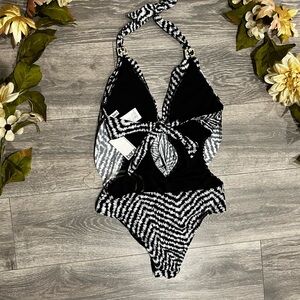 Bar III Cabo cowlneck drapey black white zigzag One-Piece monokini Swimsuit. S
