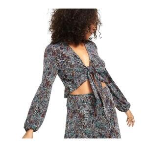 Bar III Colorful Tie Front V-Neck Ruffle Hem Balloon Sleeves Crop Top