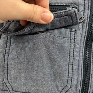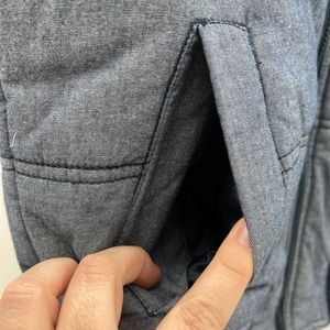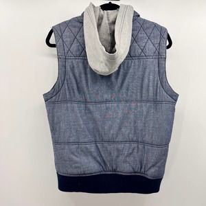 Bar III hooded full front zipper puffer vest, with four pockets, two zippered, gray sweat shirt fabric hoodie. Unisex size small.