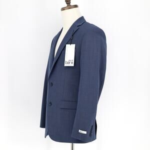 Bar III Men's Solid Blue Wool-Blend Slim Wrinkle-Resistant Suit Jacket Size 38R New with tags MRSP $425 Classic look with its skinny silhouette Fits closest to the body with a narrower chest, shoulders, waist, sleeve and shorter jacket Single-breasted Two-button closure Wrinkle resistant Fully lined Notch lapel Shell: 55% wool / 41% polyester / 4% elastane Lining: 100% polyester Dry clean Length 31" Armpit to armpit 19" Shoulders 17.5" Sleeve 25.5"