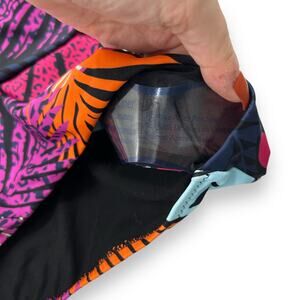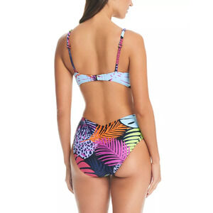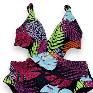 Vibrant tropical print. Deep V-neckline. Bold and stylish design.