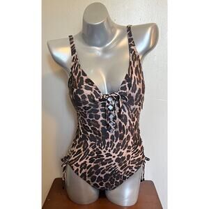 Bar III One Piece Swimsuit Sz Small Brown Leopard Print Lace Up Sides Womens NEW