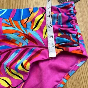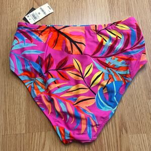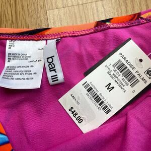 New with tags tropical print bikini bottom from Bar III, size M. High waisted with gathered details on sides. Pink background with multicolor tropical print that makes them great to pair with multiple colors of tops.