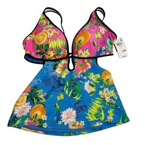 Top: Bar III Printed Plunge Neck Tankini Top - molded push up cups, tie back closure, adjustable straps by tying, plunge neckline, lined, hits at hips
