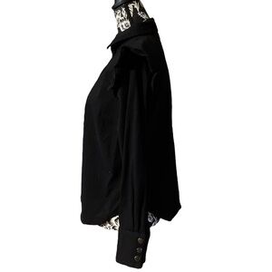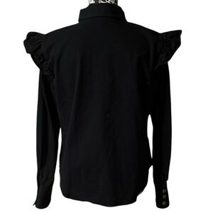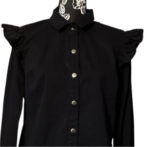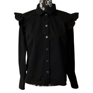Black ruffle shoulder blouse with silver metal snap button front closure.