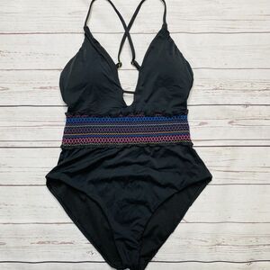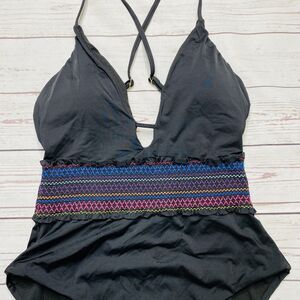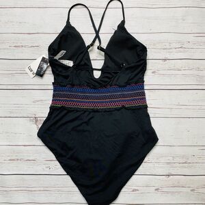 Bar III Smocked Plunging One Piece Swimsuit Black M New Rainbow Embroidered