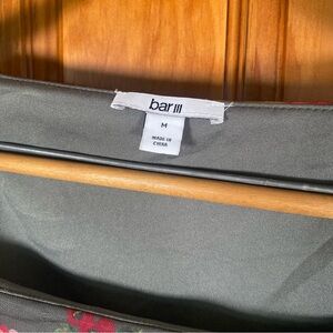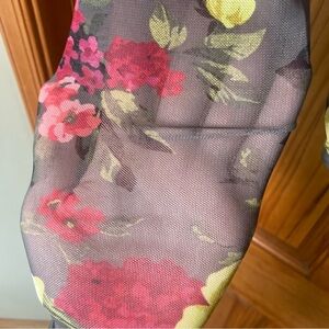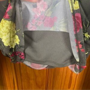 Chic and fun blouse by Bar III perfect for a night out! Features an earthy green color with contrasting pink florals, a square neckline, ruffled front, sheer sleeves, and a body con tailored fit! The main body is fully lined. Super stretchy material!