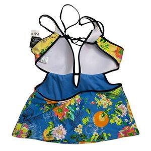 Tankini Top: Bar III Printed Plunge Neck Tankini Top - molded push up cups, tie back closure, adjustable straps by tying, plunge neckline, lined, hits at hips