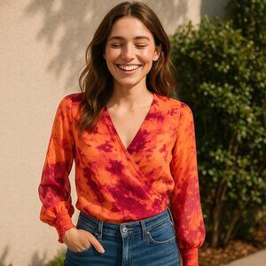Vibrant and eye-catching Bar III tie dye wrap blouse in bold pink and orange hues. Features a flattering wrap front, lined front panels for coverage, and a sheer back for a lightweight, breezy look. Long sleeves with smocked cuffs add a touch of boho charm — perfect for pairing with jeans, skirts, or high-waisted shorts.