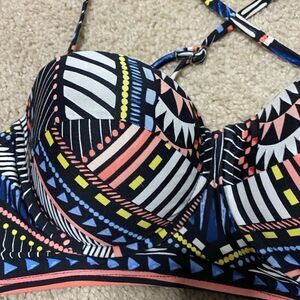 Bikini top from Bar III. Underwire cups. Adjustable straps cross in back. Size S. Gently preowned condition with no tears or stains.