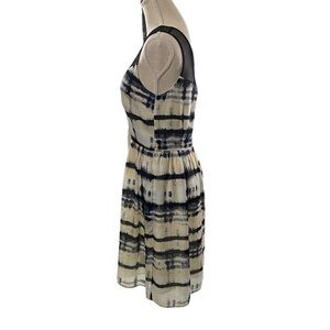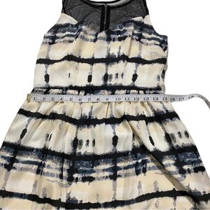 Bar III Women’s Cream Black and Blue Abstract Print At Knee / MIDI A-Line Black Mesh Chest V-Neck Fit ‘n Flare Dress Size Medium. This dress is preowned and in very good condition.