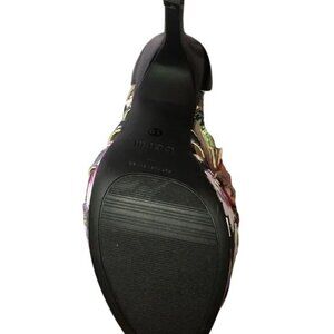 Elegant women's high heels combining bold floral print with sleek black accents, offering a stylish yet practical choice for events or professional settings.