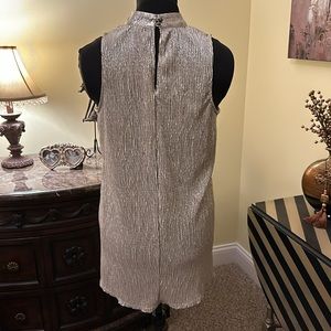 Bar III Women's Metallic Knit Blouse Soft Gold size Large. Statement-making sleeveless mock turtleneck top with a round hi-lo hemline. It's a great top for the holidays! There are side slits, a double button & loop closure at the back, and its keyhole is textured metallic throughout the top.